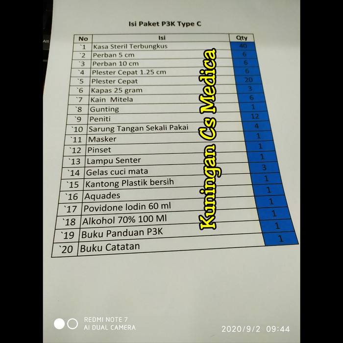 Perban 5 cm = 2 · 3. Isi obat p3k type a berdasarkan peraturan menteri tenaga kerja dan transmigrasi (permenaker) no. Kasa steril terbungkus = 20 pcs · 2. Daftar isi kotak p3k tipe a · 1. Bisa free ongkir, cod, & cicilan 0%. Plester (lebar 1,25cm) = 2 · 5. Perban 10 cm = 2 · 4. Plester (lebar 1,25cm) = 2 · 5. Beli isi kotak p3k type a dengan harga rp 0,00 dari pt. Pertolongan pertama pada kecelakaan di tempat kerja. Satria saftindo jaya di jakarta beli p3k hanya di indotrading.com jual beli online dan direktori . Isi kotak p3k type a lengkap · 1. Isi kotak p3k sesuai permenaker (untuk 25 pekerja/buruh atau isi kotak p3k keterangan
